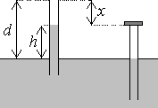 Voda vystupi vo zvislej kapilare, ponorenej do nadoby s vodou, do vysky h. Neponorena cast kapilary ma dlzku d (pozri obrazok). Volny koniec kapilary uzavrieme a kapilaru ponorime do vody tak hlboko, aby povrch vody v kapilare bol v rovnakej vyske ako hladina vody v nadobe. O aku dlzku x treba kapilaru ponorit? Predpokladajte, ze teplota vzduchu v kapilare sa pri ponoreni nezmeni. Ciselne hodnoty su: d = 21 cm, h = 8 cm, atmosfericky tlak b = 100 kPa, g = 10 cms-2.
