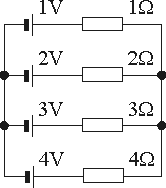 V schéme na obrázku určte prúdy prechádzajúce jednotlivými odpormi. Napäťové zdroje sú ideálne.