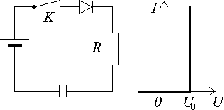Uvazujme elektricku schemu podla laveho obrazka, pricom do obvodu je zapojena dioda, o ktorej budeme predpokladat voltamperovu charakteristiku podla praveho obrazku (t.j. prepusta prud az od napatia U0). Kondenzator na zaciatku nie je nabity. Aka energia sa uvolni v priebehu nabijania kondenzatora, ked spinac K zopneme? Kapacita kondenzatora je C, napatie zdroja je Z, jeho vnutorny odpor neuvazujeme.
